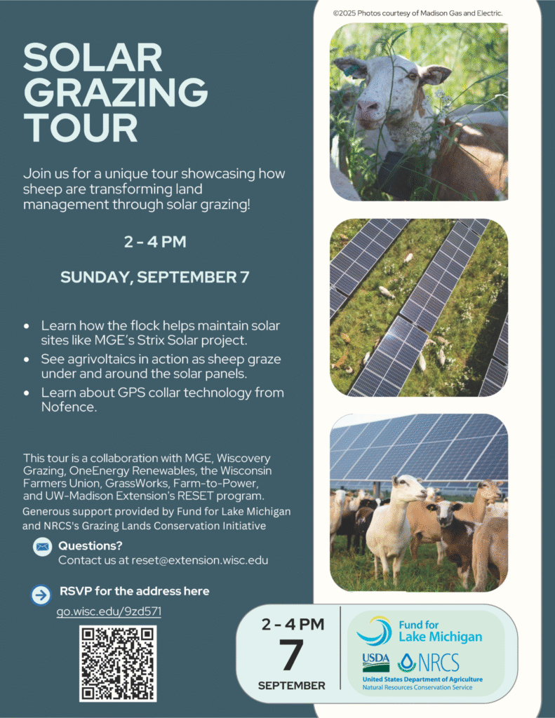 This tour is a collaboration with MGE, Wiscovery Grazing, OneEnergy Renewables, the Wisconsin Farmers Union, GrassWorks, Farm-to-Power, and UW-Madison Extension’s RESET program. Thank you for the generous support provided by the Fund for Lake Michigan and NRCS’s Grazing Lands Conservation Initiative (GLCI).