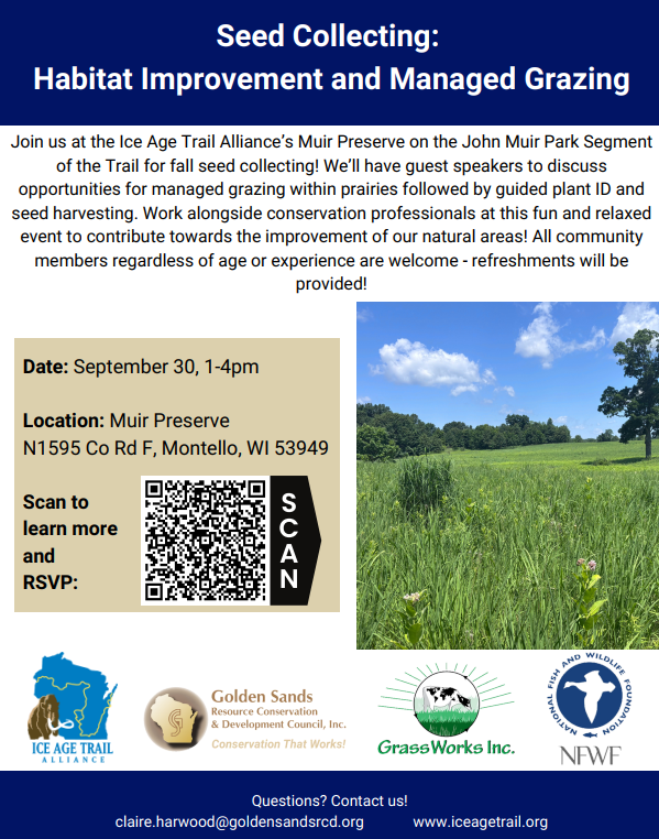 ![]() Join us at the Ice Age Trail Alliance’s Muir Preserve on the John Muir Park Segment of the Trail for fall seed collecting! We’ll have guest speakers to discuss opportunities for managed grazing within prairies followed by guided plant ID and seed harvesting. Work alongside conservation professionals at this fun and relaxed event to contribute […] |