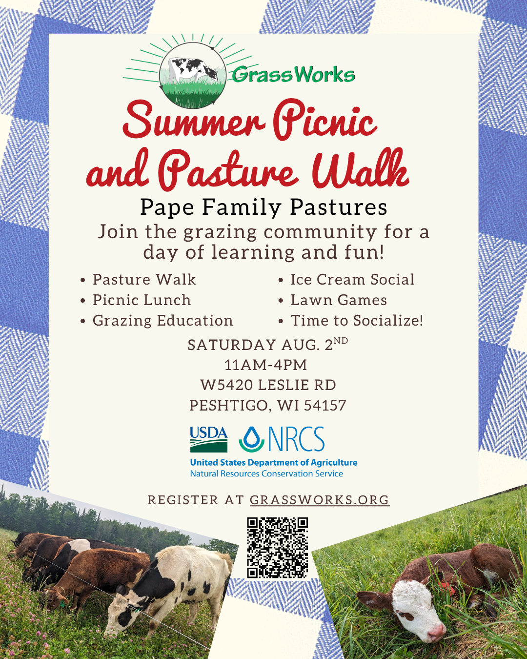 ![]() GrassWorks is excited to be hosting our 2025 annual picnic and pasture walk at Pape Family Pastures in Peshtigo, WI. If you've been missing the community and inspiration of the GrassWorks conference, the picnic is a perfect time to reconnect with your grazing network and welcome new farmers into the herd! The Pape's will kick […]