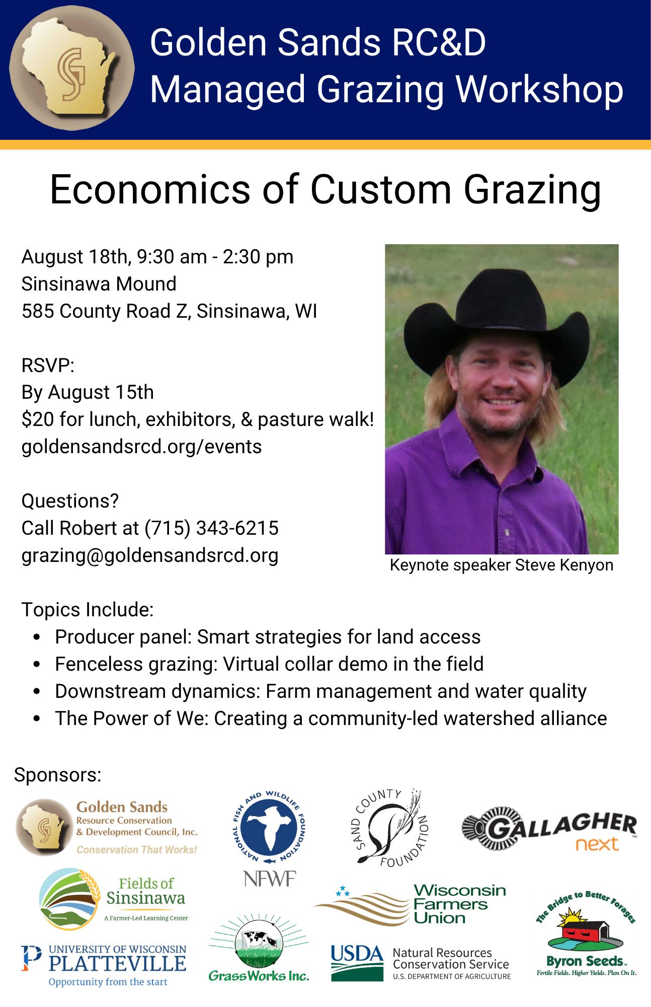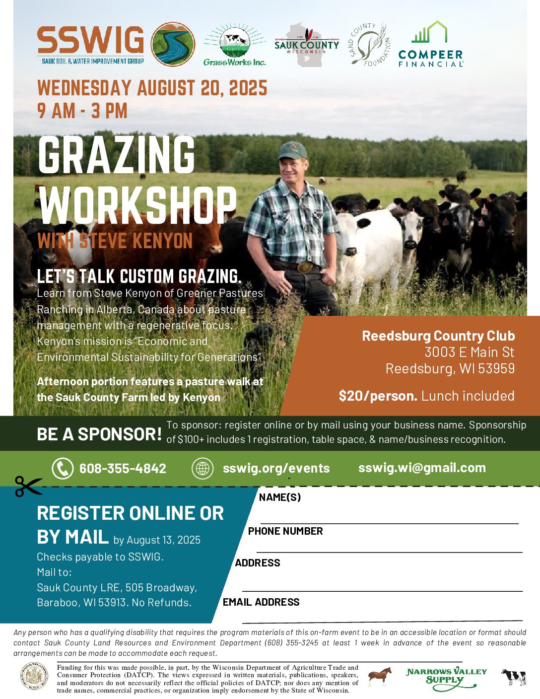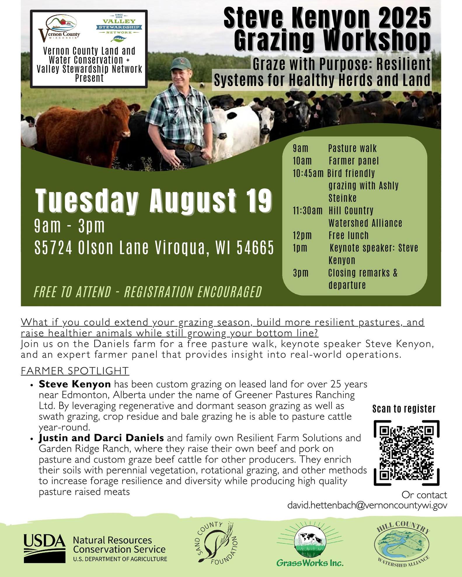 ![]() Grazing Workshop with Steven Kenyon GrassWorks is excited to support the Steve Kenyon event series taking place in Sinsinawa, Viroqua, and Reedsburg, WI! The Viroqua event is hosted by Vernon County Land and Water Conservation Department and Valley Stewardship Network and takes place on August 19th from 9am-3pm. The first half of the event will […]