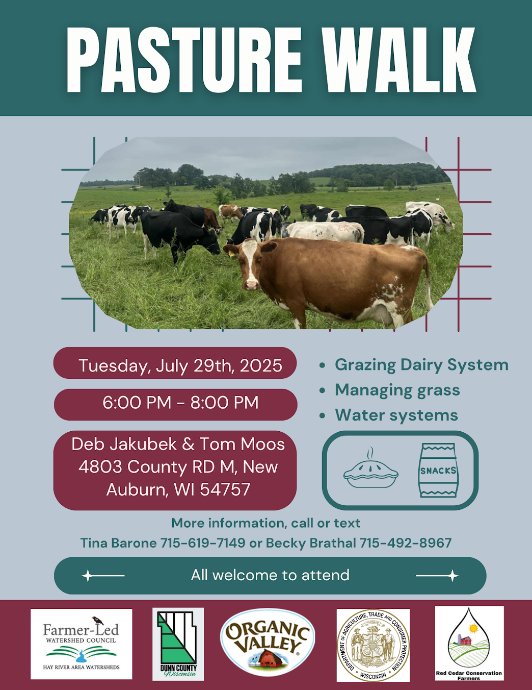 ![]() Join us for a pasture walk at Deb Jakubek & Tom Moos dairy farm in New Auburn, WI. We will see how they do a 100% grass-fed and organic grazing dairy system, exploring grass and water management on the farm. Local farmer-led groups will be in attendance and supporting this event. Deb is President of […]