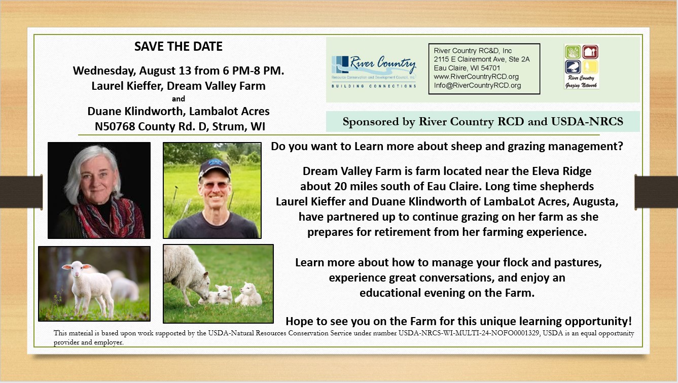 ![]() Do you want to learn more about sheep and grazing management? Join River Country RC&D to learn about the basics of sheep management, electric fencing, managed grazing and much more! Follow the River Country Facebook page to stay updated on their events. Dream Valley Farm is farm located near the Eleva Ridge about 20 miles […]