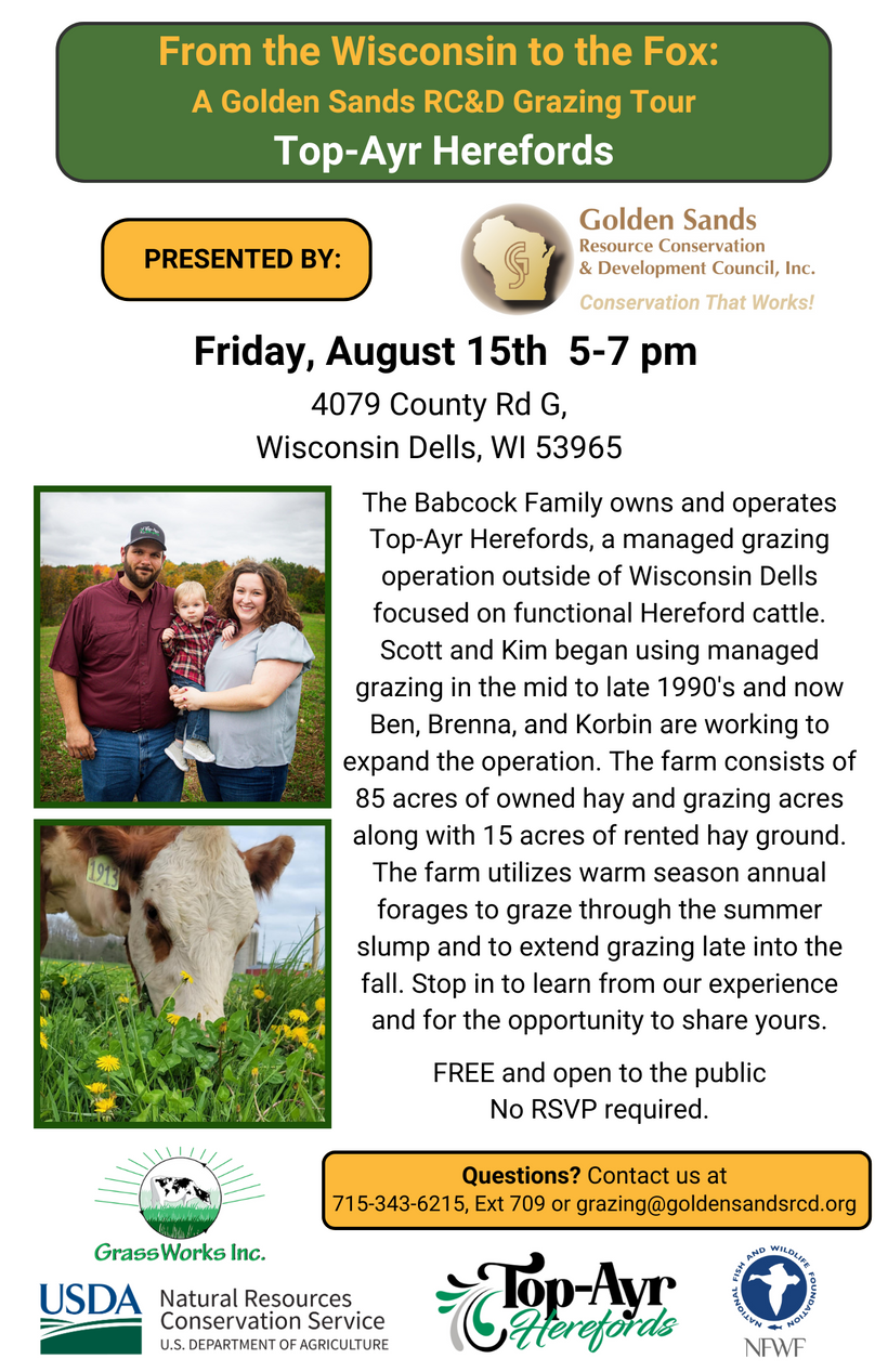 ![]() About the event Join Golden Sands RC&D for the WI to the Fox Pasture Walk Series! The Babcock Family owns and operates Top-Ayr Herefords, a managed grazing operation outside of Wisconsin Dells focused on functional Hereford cattle. Scott and Kim began using managed grazing in the mid to late 1990's and now Ben, Brenna, and […]