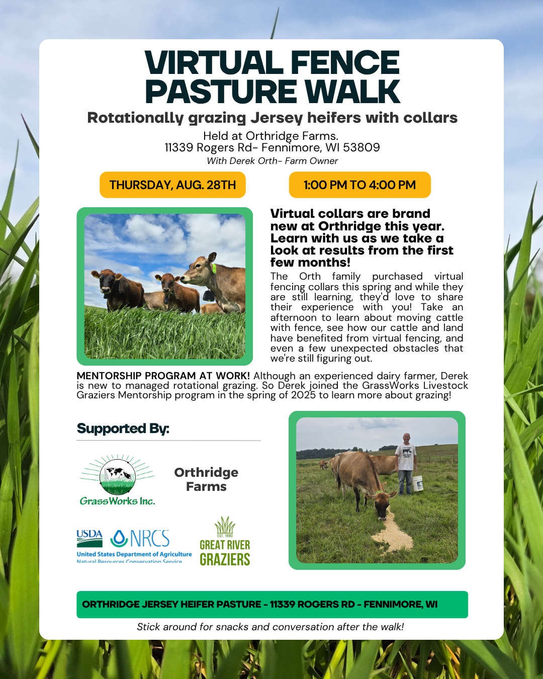 ![]() Want stronger forage, healthier cattle and a better bottom line? Join us on the Klinkner farm in Genoa, WI for a free pasture walk and farmer panel that provides insight into real-world operations. GET AN IN-DEPTH LOOK AT: Grazing cover crops Integrated silvopasture Fencing/watering systems Rotating grazing dairy & beef Seasonal stocking rates Winter operations […]