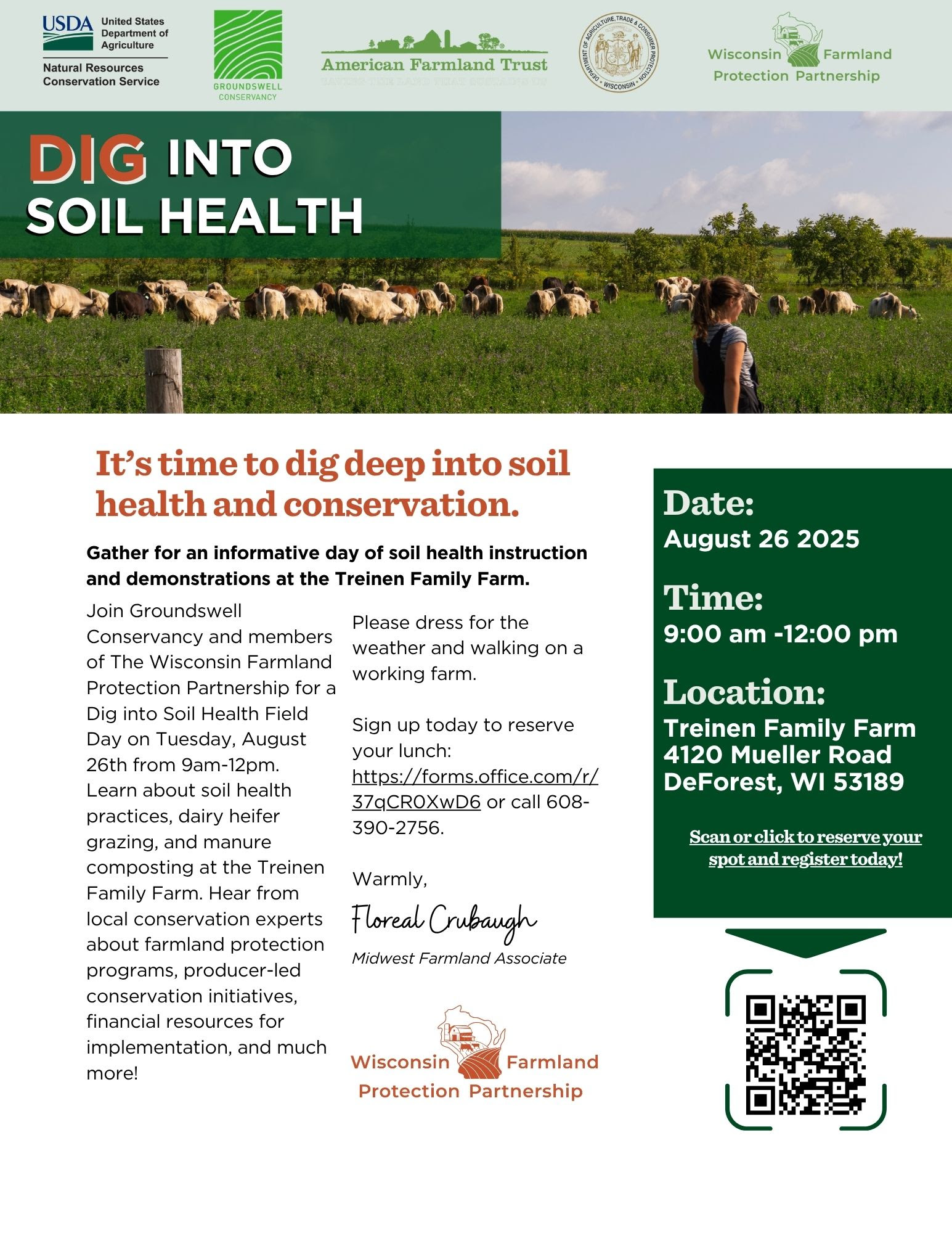 ![]() It’s time to dig deep into soil health and conservation. Gather for an informative day of soil health instruction and demonstrations at the Treinen Family Farm. Join Groundswell Conservancy and members of The Wisconsin Farmland Protection Partnership for a Dig into Soil Health Field Day on Tuesday, August 26th from 9am-12pm. Learn about soil health […]