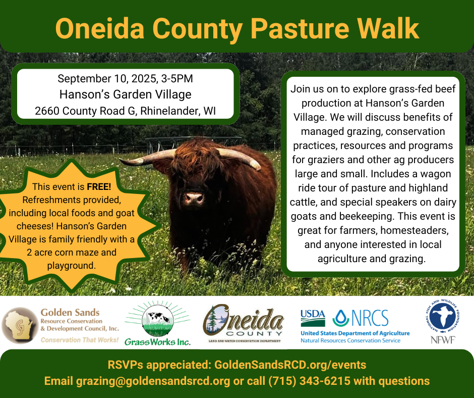 Join GrassWorks, Golden Sands RC&D and Oneida County Land and Water for a pasture walk at Hanson's Garden Village in Rhinelander. We will discuss the benefits of grass-based agriculture, managed grazing & conservation practices, and identify grazing resources and programs for beginning or existing livestock operations. We'll tour Hanson's Garden Village, seeing the diverse operations […]