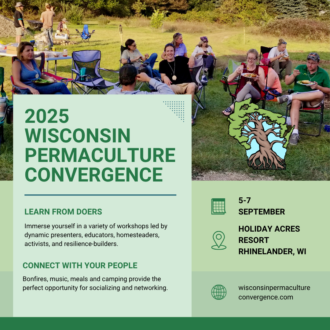 The Wisconsin Permaculture Convergence is a yearly event that brings people together to network, build community, skill share and celebrate life. The 2025 Convergence will be located in Rhinelander, Wisconsin at Holiday Acres Resort. Holiday Acres Resort4060 Shore Drive,Rhinelander, WI 54501 September 5th - 7th Email General Inquirieswipermconvergence@gmail.com Partnershipswipermconvergence@gmail.com Details and more HERE!