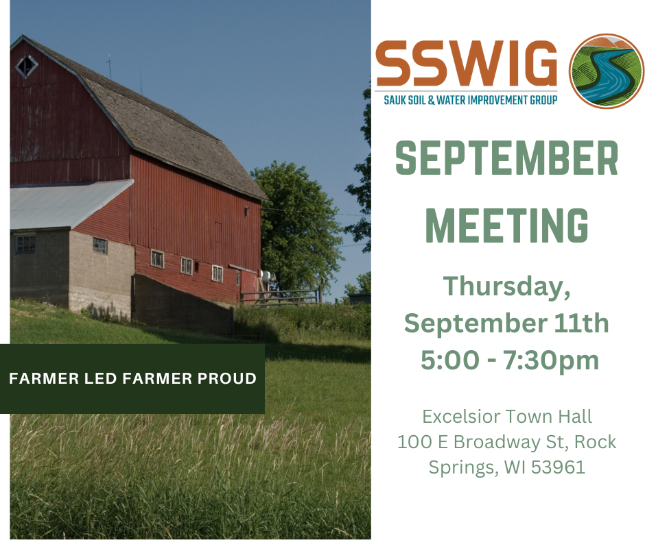 Date change!! Due to a pasture walk and Farming with Watershed Wisdom event, the SSWIG meeting will be moved from the 18th to the 11th. Join us for our next meeting on Thursday, Sept. 11th 5-7:30pm at the Excelsior Town Hall 100 E Broadway St, Rock Springs WI. Dinner is included. Details and RSVP here!