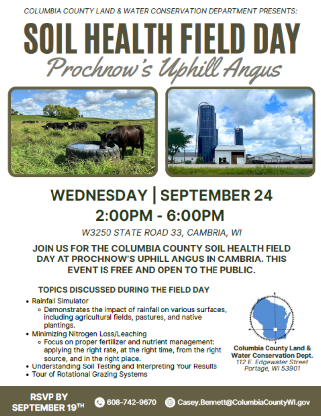 Columbia County Land & Water Conservation Department welcomes you to join them for their soil health field day at Prochnow's Uphill Angus farm in Cambria. Topics discussed will include RSVP appreciated to casey.bennet@columbiacountywi.gov by September 19th