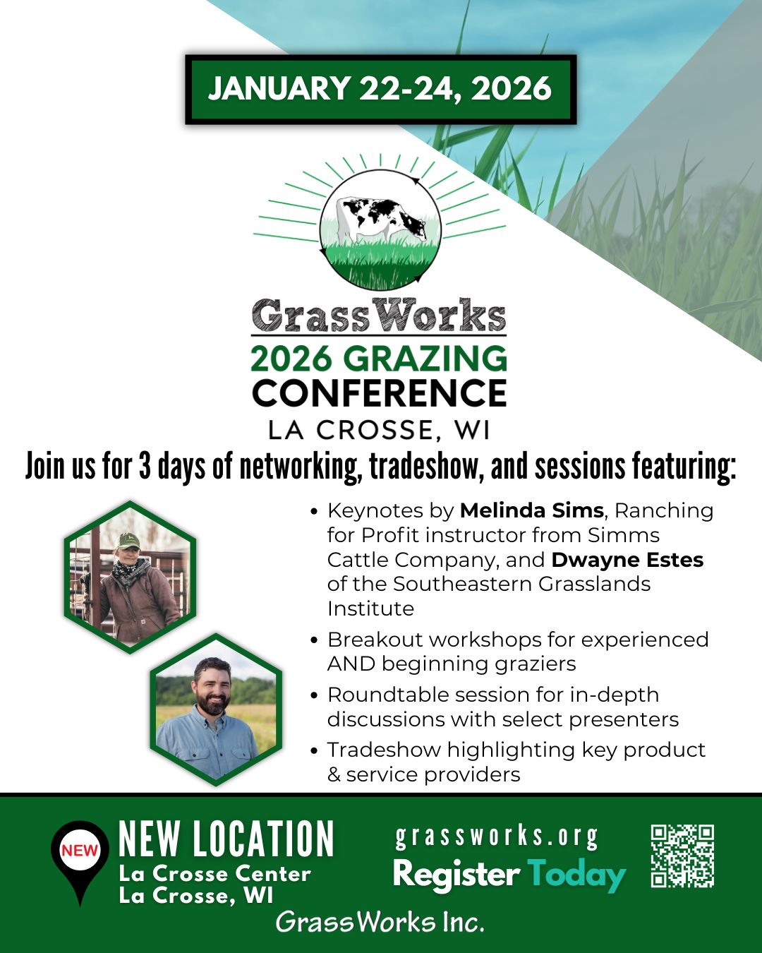 Join us at the 34th Annual GrassWorks Grazing Conference, happening January 22–24, 2026 at the La Crosse Center in La Crosse, Wisconsin!