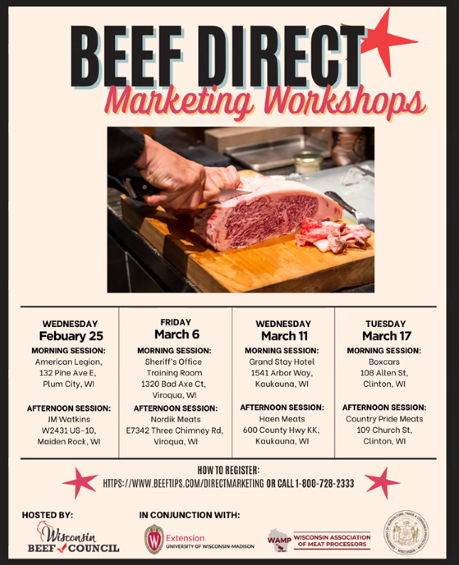 Workshops for Wisconsin farmers who are direct marketing beef, or considering it, will be held in four regional locations in the coming months. The workshops are offered by the Wisconsin Beef Council and are being held in conjunction with the Wisconsin Association of Meat Processors, UW-Madison Division of Extension, and the Wisconsin Department of Agriculture. This will be an opportunity to network with […]