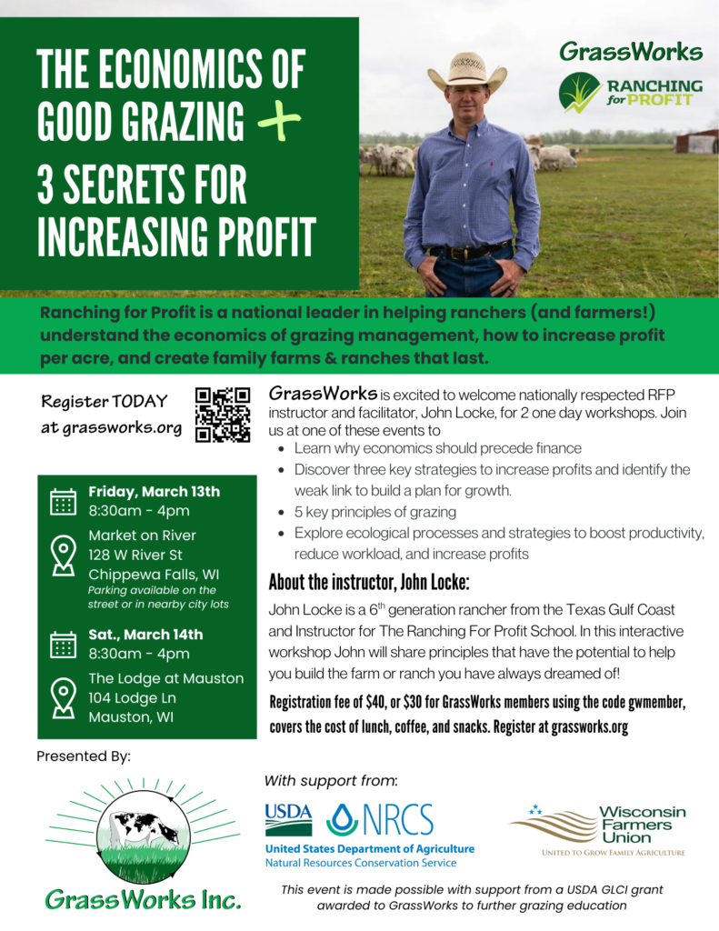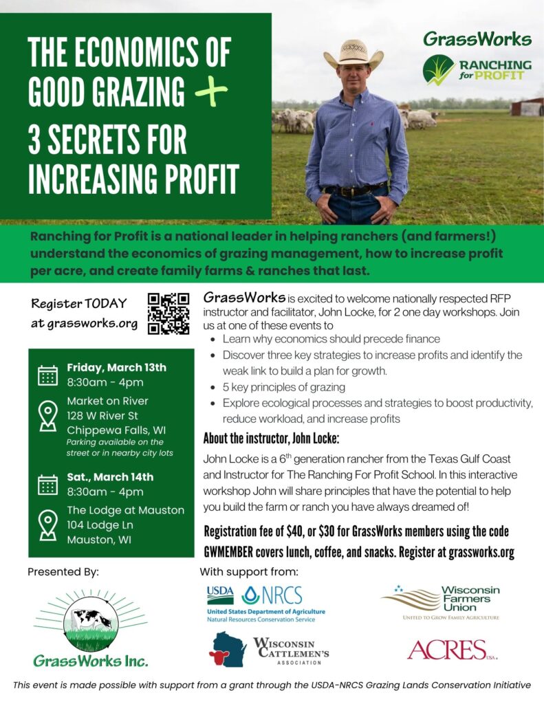 In this 2026 workshop series, GrassWorks has invited Ranching For Profit instructor and facilitator John Locke to join us in Wisconsin for two one-day events. Join us at one of these events to: